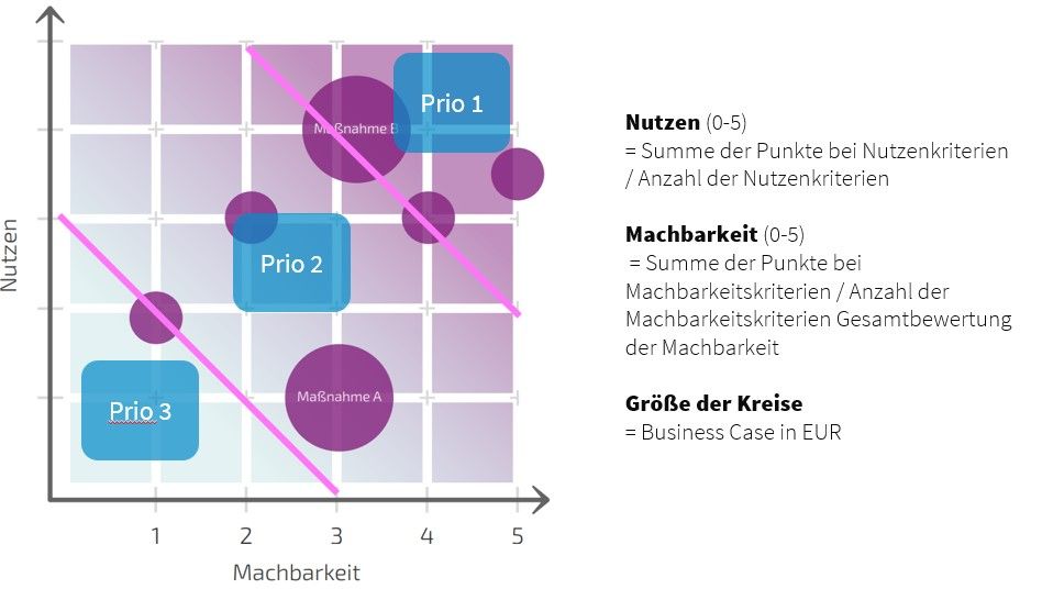 Auf Handlungsfeldebene kann diese Matrix die Grundlage bilden, um bei fortlaufender Strategiesteuerung flexibel zu agieren. Bei den unterjährigen Überprüfungen während der Strategieumsetzung können aufgrund von Marktentwicklungen und Trendänderungen weitere Handlungsfelder identifiziert werden. Dank der einheitlich definierten Priorisierungskriterien für Machbarkeit und Nutzen können diese Handlungsfelder einfach in die bestehende Matrix integriert werden und sind direkt priorisiert, ohne dass alle Handlungsfelder erneut gegeneinander abgewogen werden müssen.
